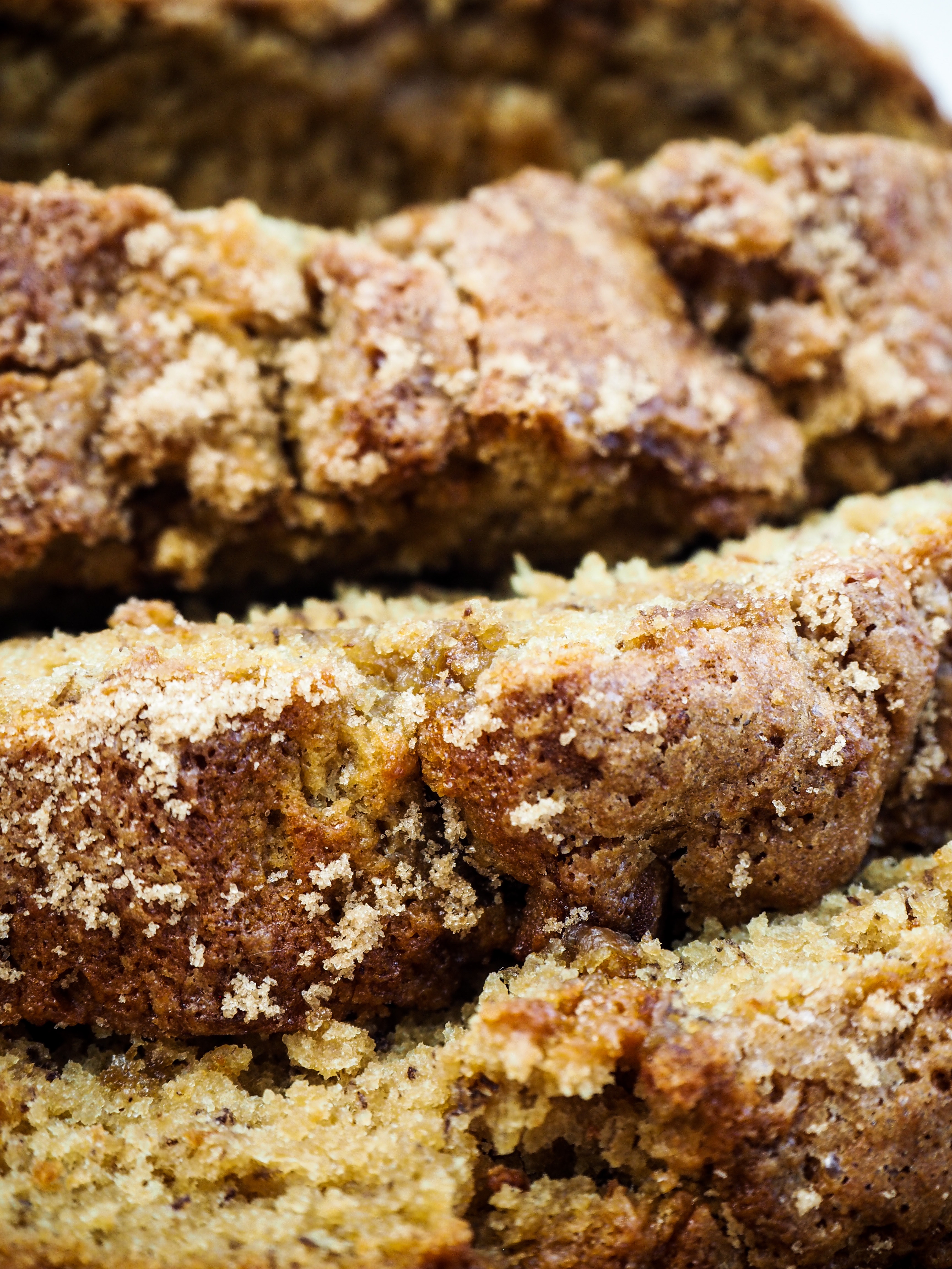So there are a few things that make this Banoffee bread super delicious and different from the classic. I love the Banoffi flavour profiles anyway I mean, banana, butter, toffee, what isn’t to love? But made into simple loaf form is so good. It uses light brown muscovado sugar as opposed to caster sugar which gives a much richer more toffee like sweetness. But what makes this really Banoffee-ish is placing sliced butter and more muscovado sugar on top of the cake batter before baking it. The both melt down into the mix in the oven making it extra gooey and delicious in the middle while caramelising on the top for a slight toffee like crunch. SO. GOOD.