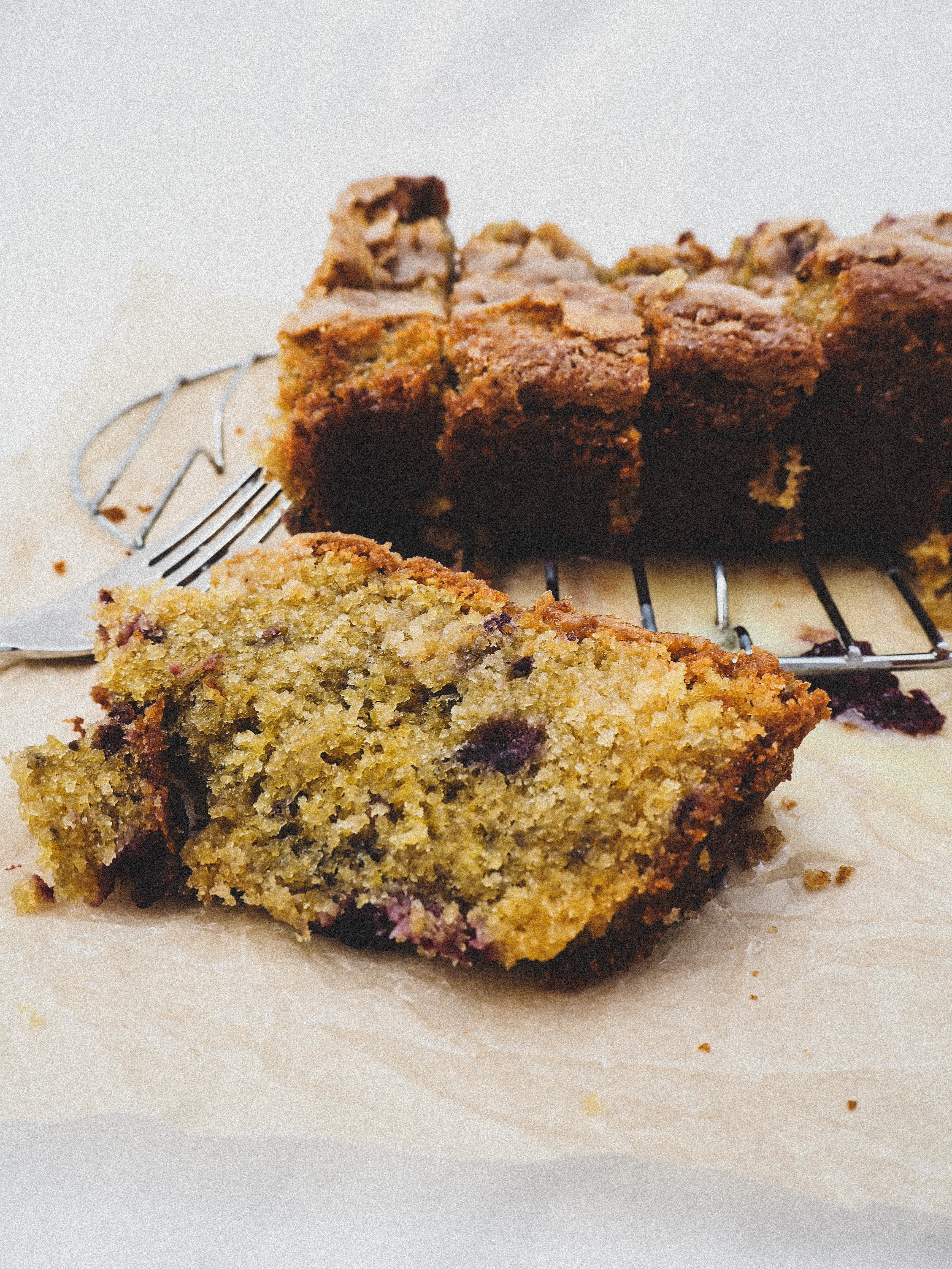 - Cream together the butter and sugar until lighter in colour, then beat the eggs in one at a time ensuring they’re fully combined each time. Mix through the flour, baking powder & bicarb, lemon juice, zest and berries until evenly distributed and the mix is fully combined.