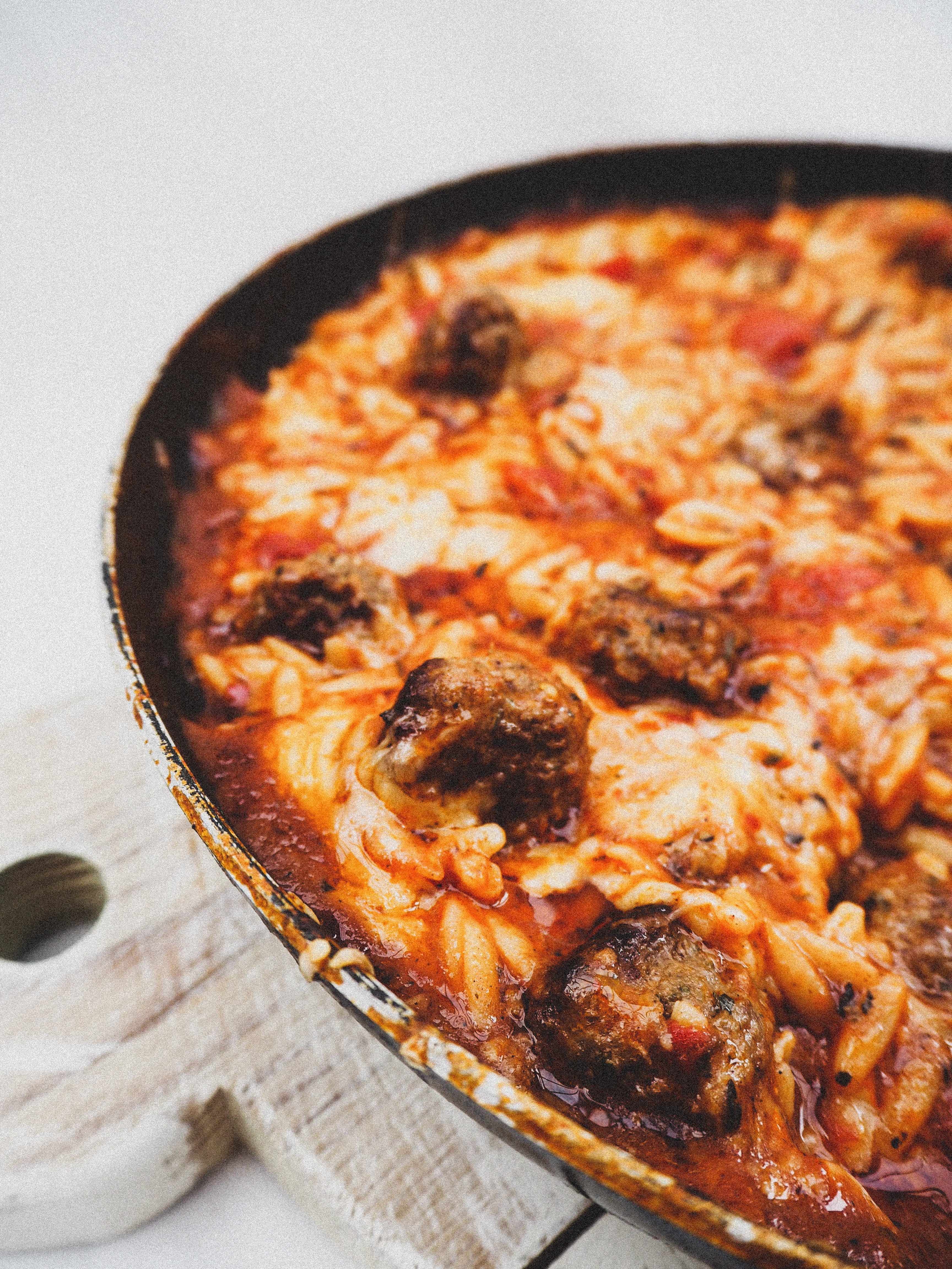 This recipe is like Summer Comfort Food, it’s really warming and comforting but still tastes light and fresh like summer. The meatballs are so delicious, parmesan works so well with beef and I promise it really does make a different to make your own vs pre made shop brought. And the Orzo is just light and fresh and saucy and so good.