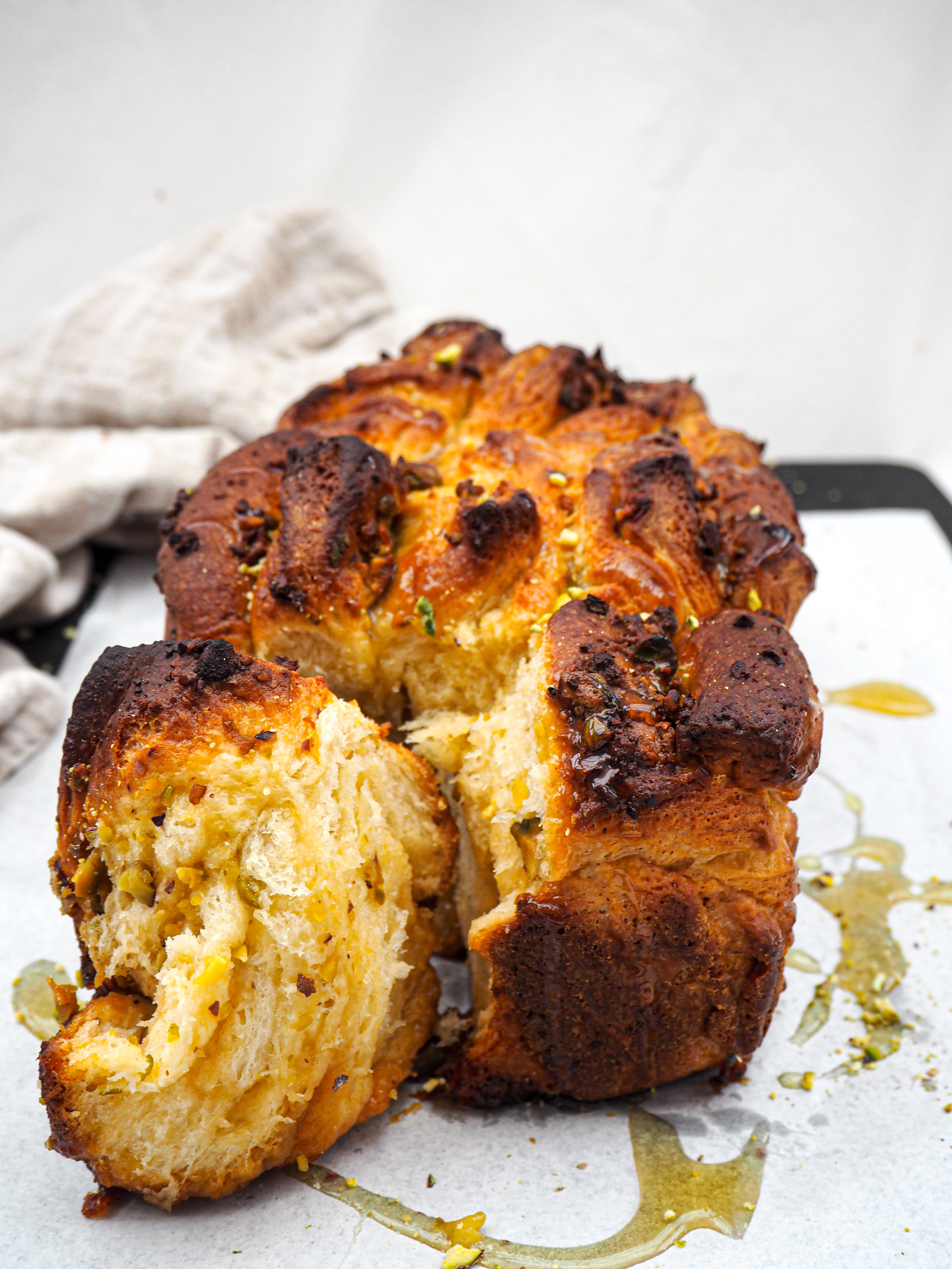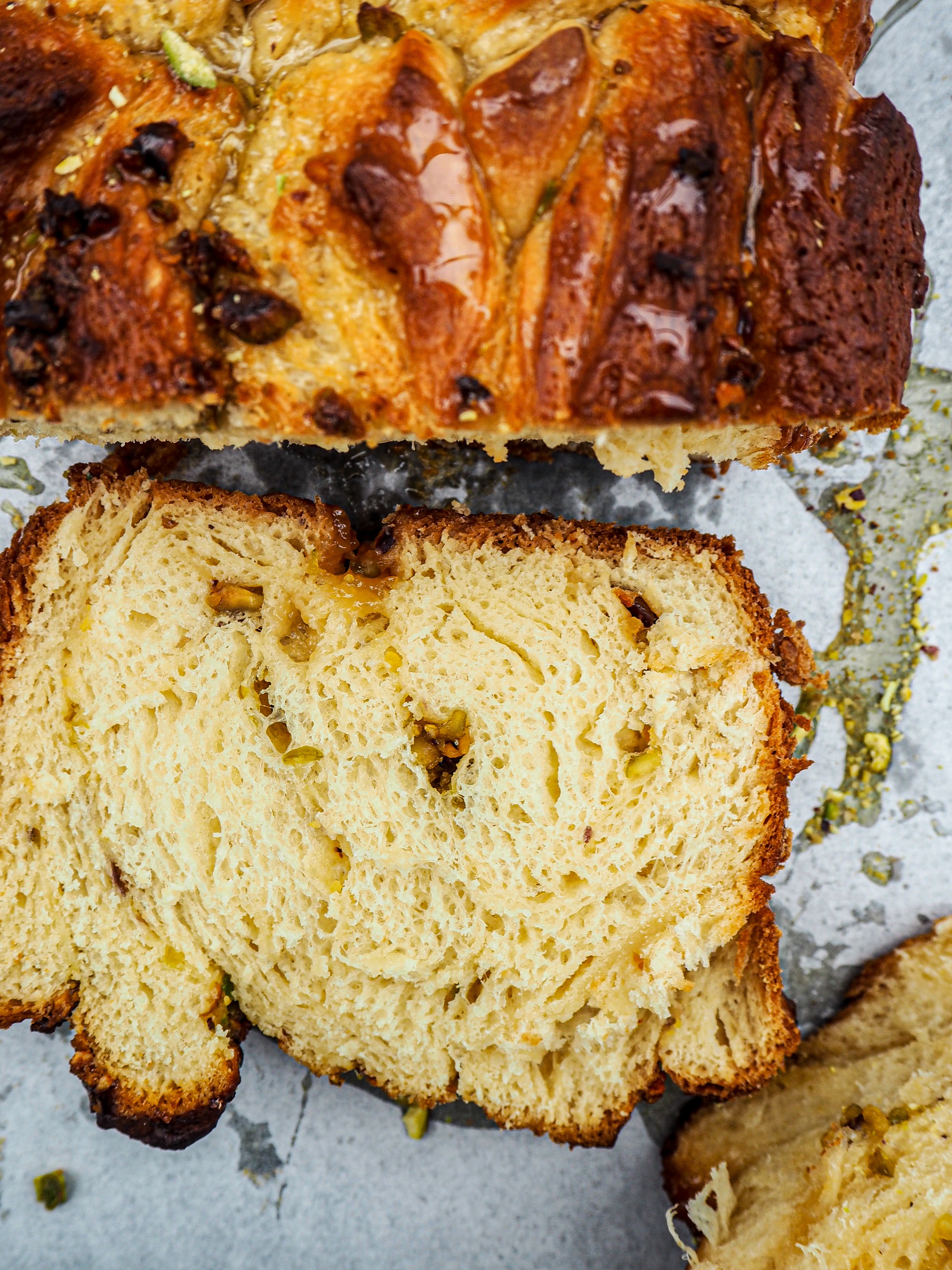 - Line a loaf tin with baking paper. Roll out your chilled dough on a lightly floured surface into a large rectangle, spread over the honey then sprinkle the pistachios on top. Roll into sausage, rolling up the longest length side (you can leave it here and bake as a normal loaf if you’d rather or shape into a twist or whatever you’d like!) then cut straight down the middle. Twist each side over each other, then cut into 6 equal chunks. Line the chunks into the loaf tin, cover again with a tea towel and leave for another 30-40 minutes until almost doubled again.