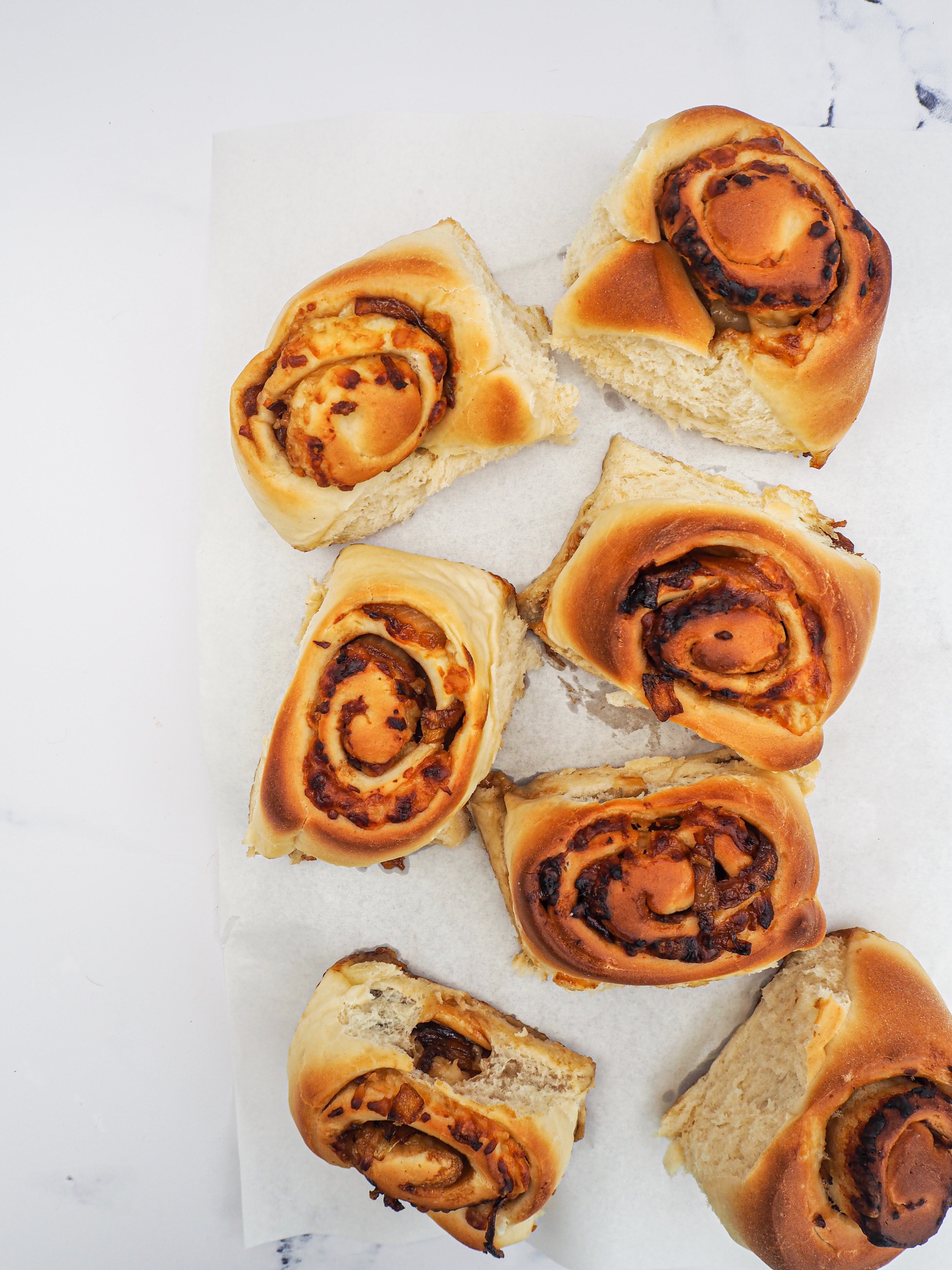 - Knock back the dough and kneed for about 1 minute, then roll out into a large rectangle. Spread the onion mix over the dough and sprinkle the cheddar over the top. Roll up the dough using the long side and cut into 10 equal buns. Line a baking tin with baking parchment and place the buns inside, then cover and leave to rise again for 30-45 minutes until doubled.
