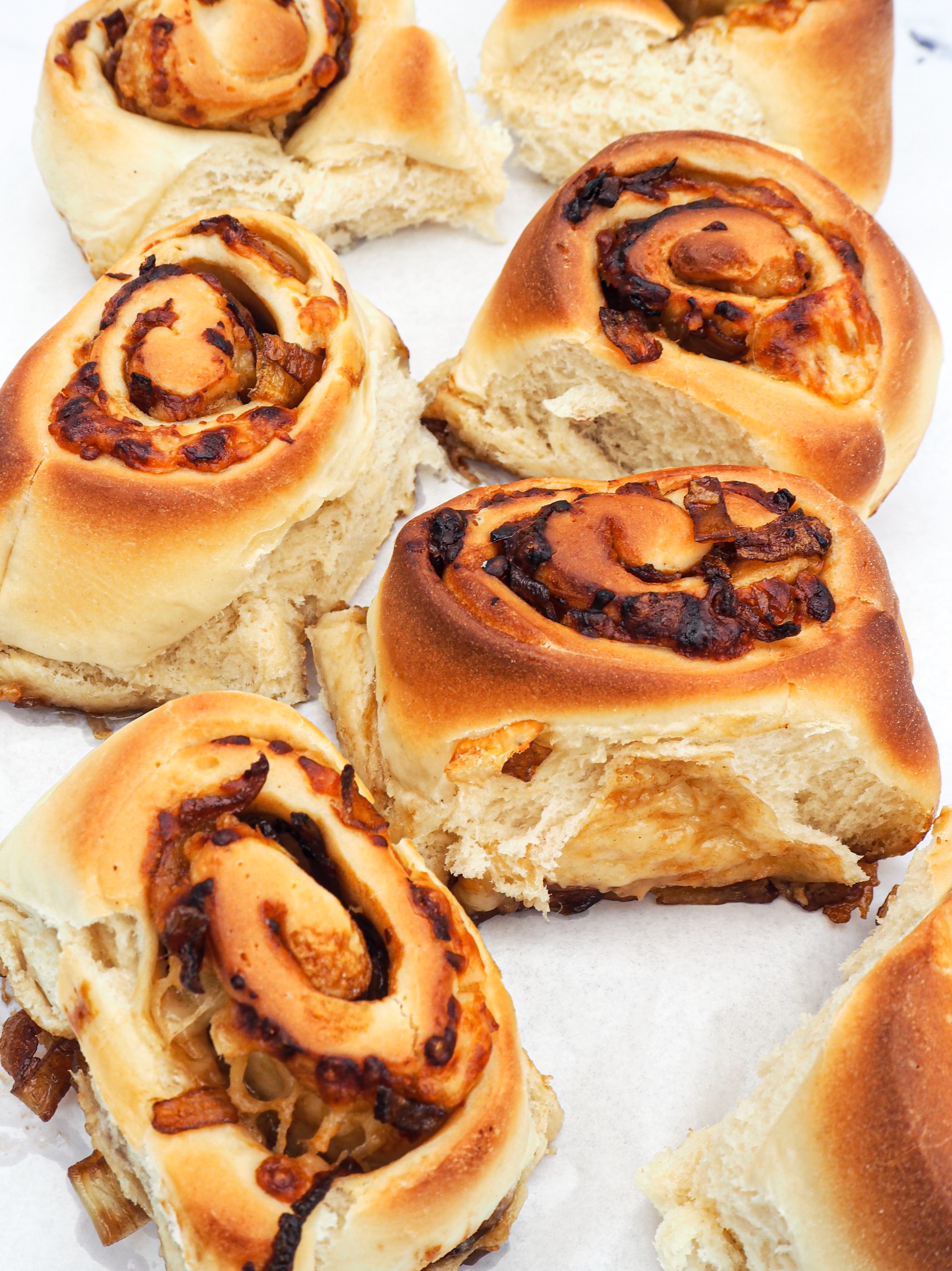 Think soft, sweet cinnamon bun dough but filled with savoury cheesy onions. WHAT a divine combo. The sweet, balsamic caramelised onions go perfectly with sharp cheddar, especially when they’re mixed together and rolled into a pillowy light dough. DELICIOUS.