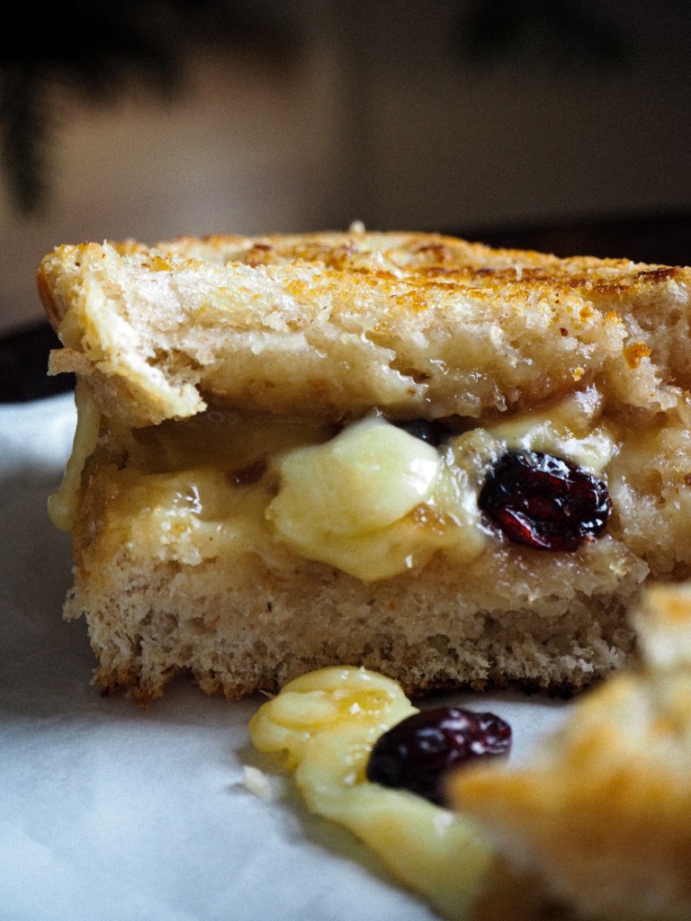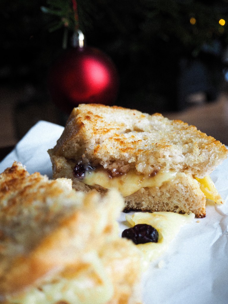 - Layer the bread with the camembert and half a tsp of the cranberry sauce per toastie, then scatter with a few dried cranberries and layer the bread together. Plan into the pan and squish the top piece of bread down to make it more compact. Fry for about 3-4 minutes on each side until beautifully golden and the cheese is melting. Keep pressing the bread together throughout. Cut and enjoy!